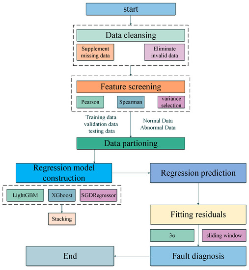 Firstly, the SCADA data were cleaned, and then the features were filtered by the Pearson correlation coefficient, Spearman correlation coefficient, and variance selection, and the LightGBM, XGBoost, and SGDRegressor models were constructed separately. Finally, the stacking integrated model was constructed. This integrated model was applied to predict the potential fault data by multi-objective regression and calculate the fitted residuals to realize the fault diagnosis of multiple components of wind turbines; the modeling process is shown in Figure 2.