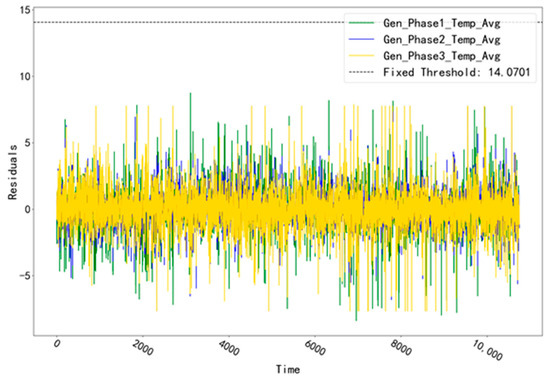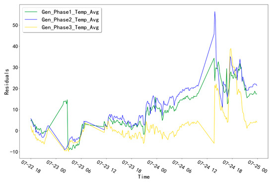 The fitted residual curves for the three temperature measurement points corresponding to GENERATOR (Gen_Phase1_Temp_Avg, Gen_Phase2_Temp_Avg, and Gen_Phase3_Temp_Avg) are shown in Figure 3. By fitting the residual data, a fixed threshold value of 14.0701 is calculated. Obviously, the residual data of the validation set does not exceed this threshold value and no alarm phenomenon occurs. The fitted residual curves for the three temperature measurement points (Gen_Phase1_Temp_Avg, Gen_Phase2_Temp_Avg, Gen_Phase3_Temp_Avg) of the GENERATOR test set are shown in Figure 4. Among them, compared with the other two measurement points, the fitted residuals of the measurement point “Gen_Phase2_Temp_Avg” increased abnormally at around 10:00 pm on 23 July 2016. Based on this abnormal phenomenon, troubleshooting was performed for the abnormal time period of this measurement point.