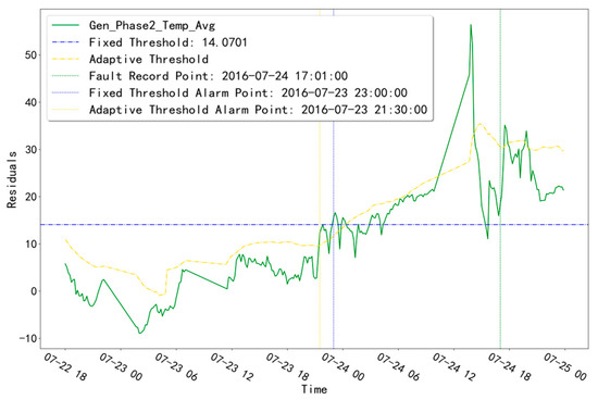 As shown in Table 2, unit T06 has a GENERATOR-type fault recorded at time point “24 July 2016 17:01”. The fault diagnosis result of “Gen_Phase2_Temp_Avg” is shown in Figure 5. The residuals (blue curve), fixed-threshold line (gray horizontal line), adaptive-threshold curve (dark red curve), fault logging time point (blue vertical line), fixed-threshold alarm time point (gray vertical line), and adaptive-threshold alarm time point (dark red vertical line) for the “Gen_Phase2_Temp_Avg” measurement point are displayed. In the fault diagnosis for the abnormal time period of this measurement point, the fixed-threshold alarm time point is “23 July 2016 23:00” and the adaptive-threshold alarm time point is “23 July 2016 21:30”. Both threshold alarm time points are earlier than the fault record point “24 July 2016 17:01”, and the adaptive-threshold alarm time is 1.5 h earlier than the fixed-threshold alarm time.
