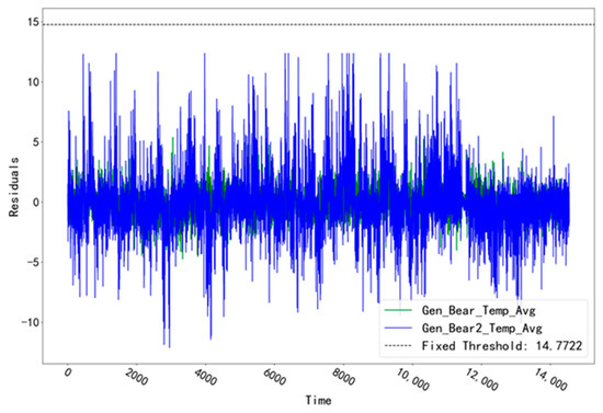 The fitted residual curves for the two temperature measurement points (Gen_Bear_Temp_Avg and Gen_Bear2_Temp_Avg) corresponding to the T07 unit in the GENERATOR_BEARING validation set are shown in Figure 6. A fixed threshold value of 14.7722 was calculated from the fitted residual data. The residual data in the validation set did not exceed this threshold value and no alarm occurred. The fitted residual curves of the two temperature measurement points (Gen_Bear_Temp_Avg and Gen_Bear2_Temp_Avg) corresponding to the GENERATOR_BEARING test set of unit T07 are shown in Figure 7. Among them, the fitted residuals of “Gen_Bear2_Temp_Avg” show a significant abnormal fluctuation at the time point “16 August 2017 14:00”, which is significantly different from another measurement point. Troubleshooting was performed for the abnormal time period of this measurement point.