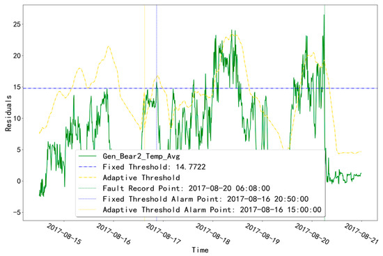 As shown in Table 2, unit T07 has a fault record of GENERATOR_BEARING-type at time point “20 August 2017 06:08”. The fault diagnosis result of “Gen_Bear2_Temp_Avg” is shown in Figure 8. In the fault diagnosis of the abnormal time of this measurement point, the fixed-threshold alarm time point is “16 August 2017 20:50” and the adaptive-threshold alarm time point is “16 August 2017 15:00”. Both threshold alarm points are earlier than the fault record point “20 August 2017 6:08”, and the adaptive-threshold alarm time is about 5.8 h earlier than the fixed-threshold alarm time.