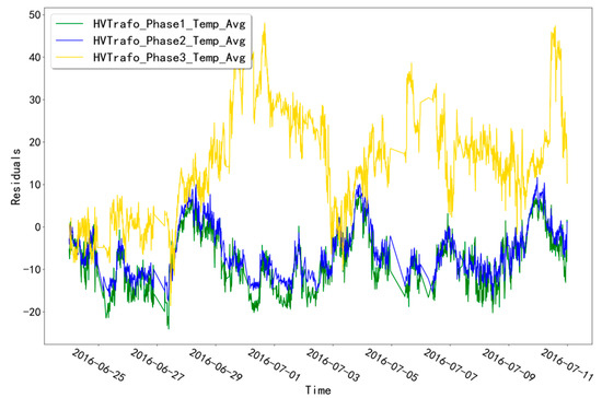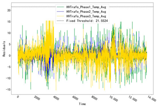 The fitted residual curves for unit T07 at the three temperature measurement points corresponding to the TRANSFORMER validation set (HVTrafo_Phase1_Temp_Avg, HVTrafo_Phase2_Temp_Avg, HVTrafo_Phase3_Temp_Avg) are shown in Figure 9. The fixed threshold value of 21.5524 is calculated from the fitted residual data. It can be seen that the residual data of the validation set does not exceed this threshold value and no alarm phenomenon occurs. The fitted residual curves of unit T07 for the three temperature measurement points corresponding to the TRANSFORMER test set (HVTrafo_Phase1_Temp_Avg,HVTrafo_Phase2_Temp_Avg,HVTrafo_Phase3_Temp_Avg) are shown in Figure 10. Among them, the fitted residuals of the measurement point “HVTrafo_Phase3_Temp_Avg” increased abnormally at the time point “28 June 2016 19:00”. Based on this abnormal phenomenon, troubleshooting was conducted for the abnormal time period of this measurement point.