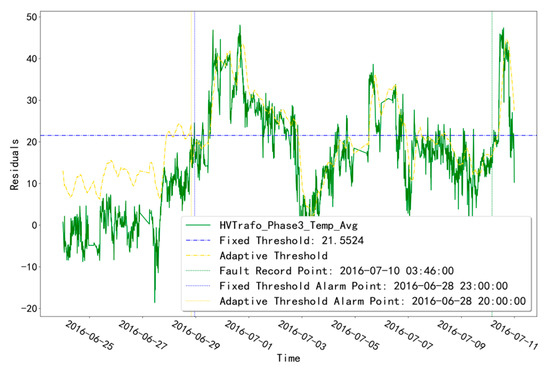 The method of setting fault diagnosis thresholds for temperature varies in different application scenarios and detection objects. Generally, fixed thresholds are obtained by calculating the mean and standard deviation of temperature data over a period of time based on the 3σ criterion. However, with large temperature variations caused by the working environment, the fixed-threshold method will not be able to make adaptive adjustments, which can easily lead to false alarms. This study proposes an adaptive thresholding method that fully integrates the idea of the 3σ criterion and time-series sliding window to calculate the mean value of residuals within each window, and the standard deviation of residuals is obtained by the validation set calculation. The residual standard deviation is then obtained by subtracting the residual mean from the validation set for each sliding window.