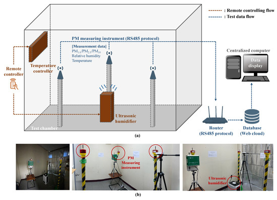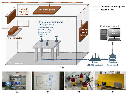 Details of (a) RH test procedure, (b) chamber, (c) chamber control system, (d) PM measurement instrument, and (e) dust generator.