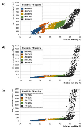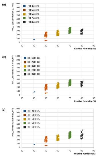 In the steam RH test, the PM concentration was measured according to the RH set by the humidifier, and the results of 7980 data for (a) PM1.0, (b) PM2.5, and (c) PM10, respectively are shown in Figure 4. The steam supply from the humidifier used in this study was continued and discontinued to maintain the set RH; because of this limitation, a constant RH level could not be maintained. Hence, among the collected data, the data within the ±1% range for each RH level were retained and plotted and analyzed. The final set of 1044 extracted data for (a) PM1.0, (b) PM2.5, and (c) PM10, respectively used in the analyses are presented in Figure 5.