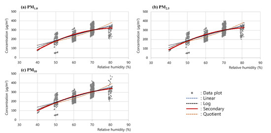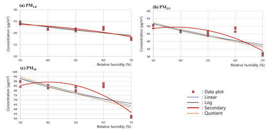 To analyze the trend of the changes in measured concentrations according to the changes in RH, a regression curve was drawn for the measured concentrations of PM1.0, PM2.5, and PM10 in the RH 30–70% range, based on the results of the RH test. In this analysis, the linear graph, as well as the log, secondary, and quotient graphs of (a) PM1.0, (b) PM2.5, and (c) PM10, were comparatively analyzed as in Figure 6; the secondary graph exhibiting the highest correlation coefficients, 0.855 (PM1.0), 0.869 (PM2.5), and 0.883 (PM10), was shown to be the one that most reliably expressed the trend of changes in PM concentrations.