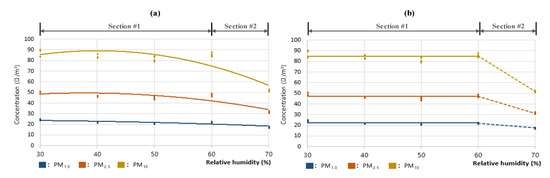However, as the changes in PM concentrations according to the changes in RH are not significant at levels below RH 60%, the interpretation should presume that the PM concentration is constant below RH 60%. Thus, additional analyses were performed on the secondary curve (a) RH-PM#1 for the PM1.0, PM2.5, and PM10 concentrations; Figure 7 shows the graph (b) RH-PM#2 presuming constant PM concentrations below RH 60%. For this, the RH 30–60% range was set as #1, and the RH 60–70% range was set as #2. Moreover, the average errors across the PM1.0, PM2.5, and PM10 data for Section #1 of RH-PM#1 and RH-PM#2 were comparatively analyzed. The results indicated that for all three PM types, PM1.0, PM2.5, and PM10, RH-PM#2 had lower average errors than RH-PM#1, indicating a higher level of suitability. This implied that the measurements below RH 60% had a constant concentration; further, when the maintained level was approximately 50 μg/m3 (for PM2.5), that is, the reference concentration in the test, gaseous vapor was determined not to affect the PM concentration measurements by light-scattering sensors. In addition, as previous studies showed that the deposition rate of PM increases when the particle size increases for various reasons, including adsorption [37,38,39], the fall in concentration for the levels above RH 60% was presumed to be because of the adsorption of PM on the condensed water particles at a high humidity level and, thus, should not be interpreted as a measurement error of the light-scattering sensor.