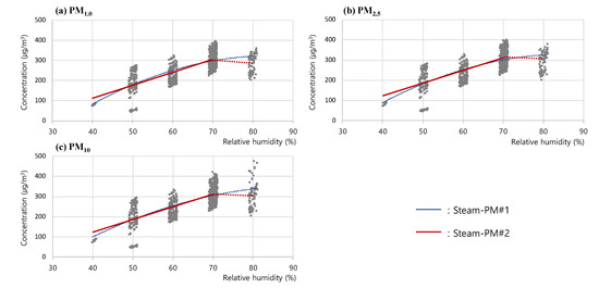 Next, to analyze the trend of the changes in measured concentrations according to the changes in steam, a regression curve was drawn for the measured concentrations of (a) PM1.0, (b) PM2.5, and (c) PM10 in the RH 40–80% section, based on the results of the steam RH test as in Figure 8. In this analysis, as with the previous RH test analysis, the linear graph, as well as the log, secondary, and quotient graphs, were comparatively analyzed, and the secondary graph (Steam-PM#1) exhibiting the highest correlation coefficients, i.e., 0.727 (PM1.0), 0.722 (PM2.5), and 0.709 (PM10), was shown to be the one that most reliably expressed the trend of the changes in the PM concentration.