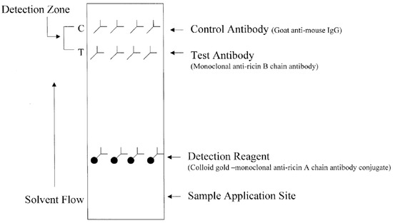 - Shyu, R.H.; Shyu, H.F.; Liu, H.W.; Tang, S.S. Colloidal Gold-Based Immunochromatographic Assay for Detection of Ricin. Toxicon 2002, 40, 255–258. [Google Scholar] [CrossRef]