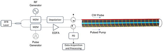 The light coming from a 1530 nm Distributed Feedback (DFB) laser is divided into two branches by a 3 dB optical coupler. The top branch is sinusoidally modulated by a Mach–Zehnder Modulator (MZM) driven by an RF generator to provide a continuous-wave (CW) probe signal launched from the far end of the sensing fiber through an optical circulator. Its frequency is downshifted by approximately 10.8 GHz from the pump frequency and scanned over a 1 GHz range (equivalent to a dynamic range of 20 mε). A passive depolarizer is used to avoid polarization fading [33]. In the bottom branch, another Mach–Zehnder modulator, driven by a pulse generator and followed by an Erbium Doped Fiber Amplifier (EDFA), is used to generate 20 ns pump pulses (equivalent to a 2 m spatial resolution) with a 30 kHz repetition rate, launched into the sensing fiber from a second optical circulator. The same circulator also routs the probe signal to a 125 MHz photodetector (PD). For each position along the sensing fiber, the frequency scan of the probe light allows us to reconstruct the Brillouin Gain Spectrum (BGS) due to the backscattering signal generated by the pulsed pump. The specific frequency corresponding to the maximum of the BGS—called the Brillouin Frequency Shift (BFS)—depends on the local temperature and strain acting on the sensing fiber. After the PD, the signal is sampled by a 125 MS/s Analog-to-Digital Converter (ADC) card (equivalent to an 80 cm spatial sampling) and processed to recover the BFS profile along the whole length of the sensing cable. The measurement accuracy of the employed BOTDA interrogator has been verified to be better than 0.5 °C/10 µε.