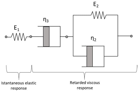 This mechanical behavior is well reproduced by a Burger model, in which the Maxwell and Kelvin–Voigt models are connected in series (Figure 3). This model is broadly used for modeling the first and the second characteristic stage of creeping in polymeric materials [40]. The model is governed by the following law: