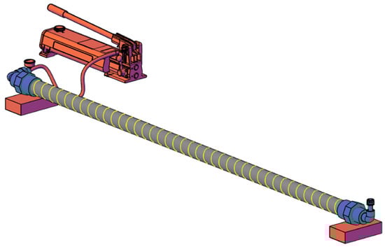 During this experimental phase, we used HDPE pipe bars of 2 m length with an external diameter of 63 mm and different Nominal Pressures (PN), i.e., different thicknesses. Specifically, PN10, PN16, and PN25 bars have been tested. Each type of bar has been pressurized with water using a hydrostatic pump connected to 1 of the edges (Figure 4). On the other edge, a vent valve has been installed to remove any internal air bubbles.