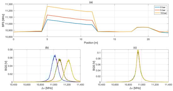 (a) Measured BFS profiles for different pressure values applied to the pipe. (b) BGS profiles measured on the helically wrapped sensing fiber in the central part of the pipe (8 m). (c) BGS measured on the temperature-compensation fiber in the same position as (b).