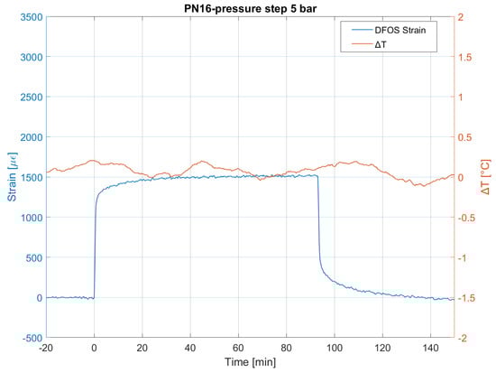 Mean spatial strain and temperature variation measured by DFOS during the pressure test on the PN16 pipe.