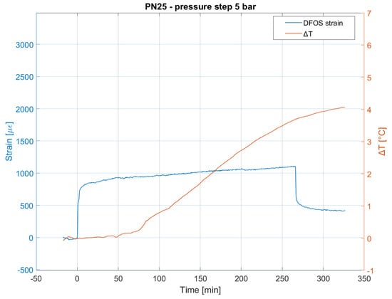 Thermal effects are instead evident during the pressure test on the PN25. In this case, the loose part of the DFOS sensor layout measured a temperature variation of up to 4 °C. This variation involves thermal deformation that is not recovered in the unloading stage, as can be seen in Figure 9.
