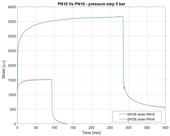 Comparison between mean spatial strain measured by DFOS on PN10 and PN16 pipes pressurized to 5 bar. Both experiments have been performed at a constant temperature.