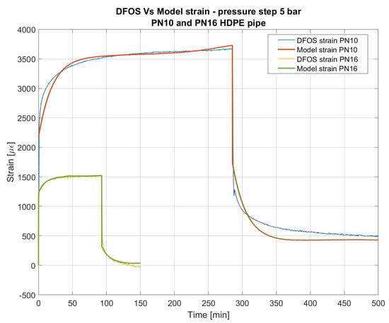 Comparison between the strain measured by DFOS and the strain modeled using the Burger creep model for PN10 and PN16 HDPE pipe pressurized to 5 bar.