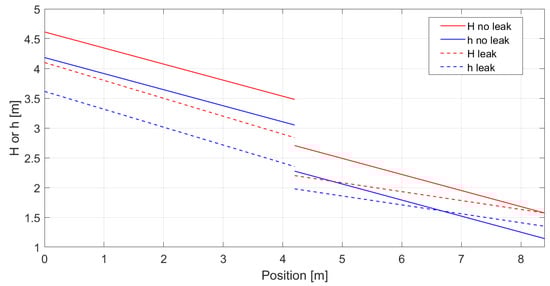Hydraulic head and piezometric height along the pipeline before (full lines) and after (dashed lines) the opening of the leakage valve.