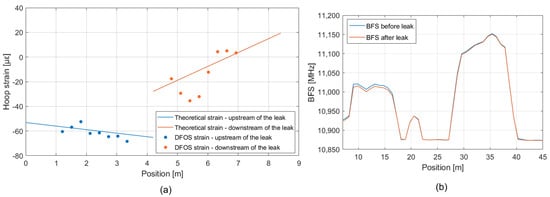 Figure 13a shows the experimental hoop strain (dot markers) measured by the DFOS compared to the theoretical prediction (represented by a straight solid line) for both the upstream and downstream sections of the pipeline after the opening of the valve. Experimental hoop strain data have been extracted by processing the BFS acquired before and after the leak (Figure 13b) with the method described in Section 2. The pipeline section upstream of the leakage valve is positioned between 9 and 16 m, whereas the downstream one is from 29 m to 36 m. These positions refer to the real length of the fiber cable. The peak at position 20 m is given by the connector.