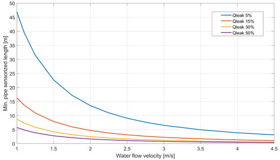 On the operational level, the strain accuracy of the interrogation unit sets the minimum extension required for detecting properly the variation of . Figure 14 shows how the minimum required length changes on a PN10 HDPE pipe with an external diameter of 32 mm and a DFOS cable spacing layout of 4 cm by considering different flowing velocities and different percentages of leakage.