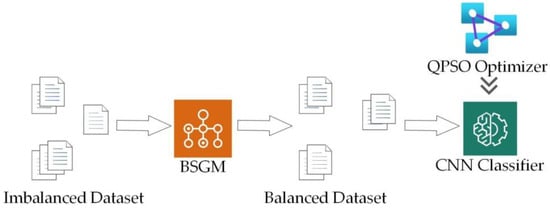 This section describes the proposed BSGM-QPSO-1DCNN model, which combines the BSGM hybrid sampling technique and the QPSO algorithm. The model is illustrated in Figure 1. The model starts by preprocessing the original data, including numericalization, normalization, and one-hot encoding. Then, the original dataset is divided into a training set and a testing set. The training set undergoes BSGM hybrid sampling, while the testing set remains unchanged for model evaluation. Next, the QPSO algorithm is employed to automatically search for the optimal parameters within the CNN. Once the optimal parameters are obtained, the model is trained using the BSGM-processed training set. Finally, the model is tested using the unprocessed testing set.