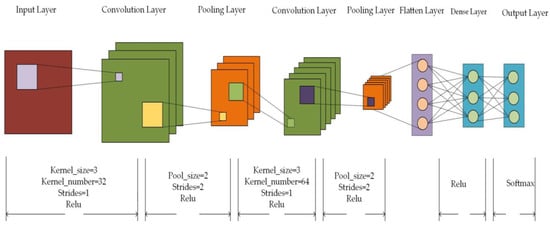 The CNN structure designed in this paper is shown in Figure 2. The network structure consists of two convolution layers, two pooling layers, one Flatten layer, and two Dense layers. The activation function of the two convolutional layers is set to Relu, the activation function of the first Dense layer is set to Relu, and the activation function of the second Dense layer is set to Softmax. The convolution layer and the pooling layer are used to learn local features, and the Flatten layer is used to flatten the two-dimensional feature map into a one-dimensional feature vector. Finally, two Dense layers are used for feature recognition and classification.