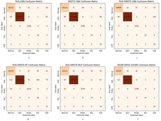 Finally, we also plot the confusion matrices of six models in the multi-classification experiments, namely ROS-CNN, SMOTE-CNN, RUS-SMOTE-CNN, RUS-SMOTE-RF, RUS-SMOTE-MLP, and BSGM-QPSO-1DCNN. The plots of these confusion matrices further validate the effectiveness of our models, and their confusion matrices are shown in Figure 4.
