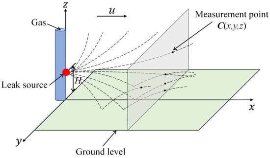 A sketch map of the plume behavior predicted by the traditional Gaussian plume model is shown in Figure 1. A Cartesian coordinate system is established with the projection of the gas source on the ground surface as the origin, the positive direction of the x-axis is consistent with the wind direction, and the positive direction of the z-axis is perpendicular to the ground level and upwards. Turner et al. [,,,] gave the expression of the Gaussian plume model as follows: