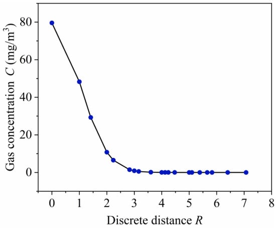which indicates the relationship between the gas concentration C of the measurement point in the gridded measurement plane and the distance R between the measurement point unit and the leak source unit. According to Equation (4), theoretically, the gas concentrations of the measurement points with the same R are equal at the same moment.