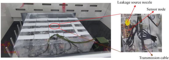In order to verify the correctness of the model and the feasibility of the concentration gradient localization method, a 5 × 5 grid confined space was established according to the real environment of the coolant leakage in a large-scale circuit system. As shown in Figure 4, the length, width and height of the grid space were 75 cm, 75 cm and 15 cm, respectively, and the volume of each unit was 15 cm × 15 cm × 15 cm. The area of the pores on the unit wall for gas to pass through was fixed at 0.4 cm × 15 cm × 4. Just like the actual large-scale circuit system, the internal space of each unit was narrow, so it was necessary to use small-volume devices for measurements. The CCS811 metal-oxide gas sensors produced by Cambridge CMOS Sensors Company were selected for the measurement of the gas concentration. The sensor has the characteristics of full digitization, high sensitivity and low power consumption. Furthermore, it adopts MEMS packaging technology, the package size is 2.7 mm × 4.0 mm, which meets the installation requirements of narrow spaces. In addition, since the temperature, humidity and air pressure inside the grid space also affects the diffusion behavior of gas, the sensor nodes were integrated with temperature, humidity and air pressure sensors for real-time monitoring and compensation. In order to adapt to the special-shaped structure in the large-scale circuit system, the acquisition board adopted a flexible board and was installed by surface mounting. The transmission of data adopted a new generation of SharkNet data transmission bus with reliability and high real-time performance.