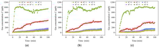 From Figure 6a–c, it can be seen that, regardless of the strength of the leak source, once the leak occurs, the metal oxide gas sensor in the unit where the leak source is located can immediately respond to the change in the concentration of ethylene glycol gas and rapidly increase. With the increase in the distance R, the response time becomes longer and the gas concentration increases more slowly. When the strength of the leak source is 3 × 10−5 mg/s, the concentration of the unit at R2 = 0 increases by 202 parts per billion per mol (ppb) within one minute after the leak occurs, while the concentration of the units at R2 = 1,2,4,5,8, increases by 22, 9, 9, 8, 3 ppb, respectively. Therefore, an obvious concentration difference is formed between the leak source unit and its surrounding units. The gas concentration rapidly decreases with the increase in the distance R, which is consistent with the Gaussian model.