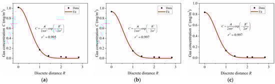 To verify whether the gas concentration distribution in the multi-grid space after the leak occurs conforms to the improved Gaussian plume model, we selected the gas concentration values at 20 min after the leak and fitted it with the improved Gaussian plume model. Since the gas diffusion behavior at a certain moment is random and irregular, it is one-sided to select the value at a certain moment for analysis. We take the average value of the gas concentration at 17–23 min as the gas concentration at 20 min and plot the relationship curve between R and C, using the Levenberg-Marquardt algorithm to perform the nonlinear curve fitting with Equation (4). The fitting results of the three experiments are shown in Figure 7a–c, and the fitted parameters are shown in Table 1.