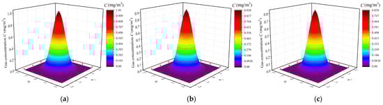 Then, we used Equation (3) to perform nonlinear surface fitting on the concentration distribution on the gridded measurement plane. The results are shown in Figure 8a–c. It can be seen that the location where the concentration and the concentration gradient are maximum match the location of the leak source (R = 0). Therefore, it is feasible to obtain a concentration distribution map by periodically scanning the concentration of each measurement point and locating the leak source unit according to the maximum concentration and concentration gradient. Since the grid space discretizes the concentration distribution, finite differences can be used instead of gradients.
