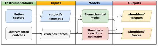 In this paper, we provide a preliminary methodological validation of an estimator of the partial weight-bearing of the lower limbs and the shoulder joint’s reaction forces during a walk with instrumented crutches. The estimate was provided by a pair of instrumented crutches to measure the ground reaction forces along their principal axis, and the forces were acquired and processed in real-time, which is suitable to collect data or provide feedback [20,21,22,27,28]. The system is validated on six healthy subjects, and since the estimation of the load on the lower limbs during partial weight-bearing is affected by dynamics factors ignored by the model, the tests were performed varying the walking cadence and the load on the crutches. Two force platforms by BTS were used to collect the reference values of the leg load. The models to estimate the shoulder reactions were identified and tested using the reference values obtained by inverse kinematics using the biomechanical model described in [11] and an optoelectronic motion capture system by VICON. The estimator could produce accurate estimates of shoulder forces, although its torque estimates were less accurate. However, as schematized in Figure 1, it does not require motion capture devices to extract the subject’s kinematics, and the system can also be used outdoors, bringing the analysis to environments outside the laboratory’s conditions. Since neurological conditions, orthopedic problems, and medical conditions could lead to alterations in gait behavior [29], this preliminary validation aimed to promote future investigations to confirm and reinforce the method by expanding the sample size and including impairments.