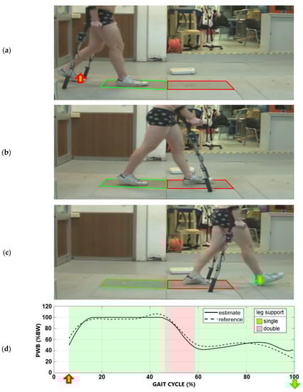 The error was calculated when all the external forces were known, and the validation intervals were obtained from the gait events recorded by the motion capture. The valid interval started after the last toe-off event outside the force platforms, shown in Figure 3a, and it ended at the first heel contact outside the force platforms, as shown in Figure 3c. The gait cycle was then divided into single and double support; Figure 3b shows the double support phase starting from the first heel contact on the force plate and ending at the next toe-off. Figure 3d shows the PWB estimated by the instrumented crutches compared with the reference during the gait cycle.