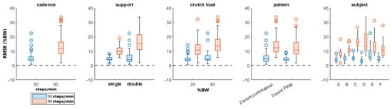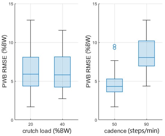 In the three-point PWB gait pattern, the PWB estimation during the single support of the unaffected limb was not useful for rehabilitation purposes, and the crutches were lifted from the ground most of the time with saturation at 100%BW of the prediction. As shown in Figure 6 and Figure 7, the unaffected limb single-support was in the interval before the double support for the three-point PWB pattern, and the errors reached the highest positive values. If only the affected limb single-support interval was considered during three-point PWB walking in all the other conditions, the RMSE was about 6.8%BW and the ME was 1.3%BW, and as shown by the boxplots in Figure 10, the RMSE was not influenced by the crutch load but only by the cadence.