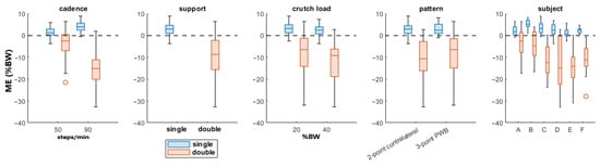 Figure 5 shows the boxplots of the ME for all the parameters divided by the gait support since it had the highest F-value in Table 4.