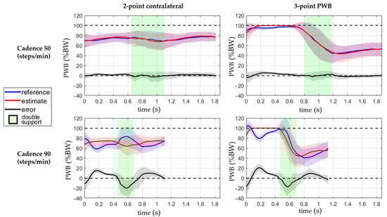 The PWB’s reference, estimate, and error are shown with respect to the time in Figure 6 and with respect to the gait cycle in Figure 7. The data are compared between the gait pattern and the cadence in Figure 6 and the crutch load in Figure 7; moreover, the double-leg support is shown in the background.