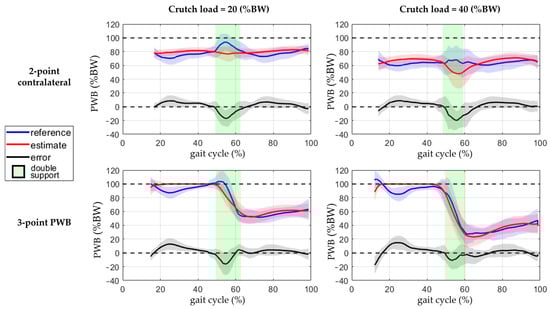 Comparison between the estimated PWB and the reference during the gait cycle and the status of the leg support. The line represents the mean value, and the standard deviation is shown with the colored band around the mean. The data are from four conditions combining the walking pattern while loading 20 or 40% of the body weight on the crutch. Data are visualized with respect to the percentage of the gait cycle, and the green and red backgrounds indicate the gait cycle interval with double-leg support. The missing data between 0–15% of the gait cycle are due to the interval with unknown external forces applied to the foot still resting on the floor.