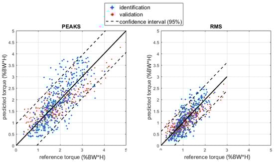 The wide dataset was then divided into identification and validation datasets. For this separation, we considered that, in accordance with the test protocol, each condition was repeated at least three times, so one trial was randomly assigned to the validation dataset, while the remaining trials were assigned to the identification dataset. With this procedure, we maintain a balanced representation of the population and conditions between the datasets with good numerosity: 2/3 for the identification and 1/3 for the validation. The model estimated the peaks and the root mean square (RMS) of the shoulder torques and forces, calculated by the biomechanical model in every stance phase of the crutches. Each subject performed at least two stance phases of the crutch on both sides in every trial.