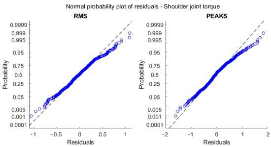 The shoulder regression model was based on RMS and the peak values for crutch force and their interaction with the subject’s height and squared height. The regression was good regarding shoulder force (R2 about 1), while it was more critical for torques (R2 about 0.6). The residuals for the RMS and peak force regression models followed a normal distribution, as shown in the normal probability plots in Figure 11, so the random behavior of the residuals was confirmed.