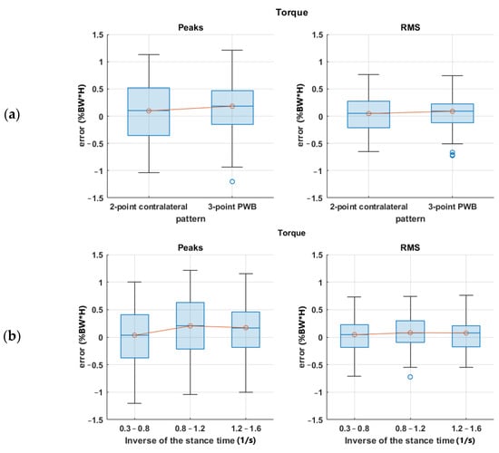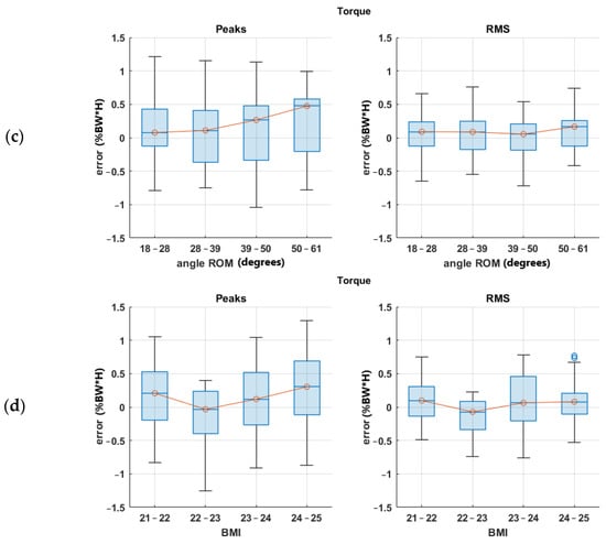 Regarding torque, the R2 was lower, and residuals were less normal. A possible justification relies on the equations describing the inverse dynamics: they are based on some anthropometric parameters determined with the help of statistical tables based on specific population samples. Precise evaluation of the effect of anthropometric parameters uncertainties on the inverse dynamics results uncertainty is complex due to non-linearities in the model equations, the large number of possible influence factors, and the recursive relation that moves the results from a distal to a proximal element. A previous investigation [37] applying the simplification principles described in [38] evidenced that anthropometric parameters may heavily affect the inverse kinetics analysis and, in our case, the reference shoulder torque and force. In the force case, equations included only segment masses and their center of mass acceleration. Torque computation also requires the segment’s inertial properties, which generally suffer from a larger uncertainty. Moreover, the correlation analysis excluded anthropometric parameters such as mass and height from the regression due to their poor correlation. The prediction error for torque as a function of the BMI anthropometric parameter can be checked with the box plots in Figure 12, in which no explicit dependency is shown, so the model validity was confirmed, and the reason for the lower torque prediction performance is not clear yet. Of course, a more complex regression model including a larger set of factors improves the correlation at the expense of introducing a large set of quantities in the description. Since our intention here was to give a rough but immediate and easily obtainable estimation to the patient and the clinician to improve gait management, we prioritized model simplicity. To this end, the regression proposed seems to be sufficiently accurate. In fact, shoulder forces were estimated with an RMS error of about 1.5% of body weight, while for torques, the RMS error was about 0.5% of the product body weight times height on a scale ranging up to 4.0 %BW*H, i.e., about 12% of the full scale of the values recorded. Such values are sufficient for a rough indication to the end user and the therapist.