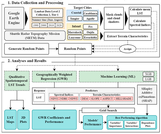 Figure 2 illustrates the methodological process of our research. The flowchart commences with data collection and processing (Section 2.2.1), followed by a series of analyses to derive the results. Initially, we gathered Landsat and Shuttle Radar Topography Mission (SRTM) data [25], processed them to calculate LST and spectral indices, and assigned these values to 3000 random points within the extent of selected Moroccan cities (Section 2.2.2). Next, a qualitative analysis of spatiotemporal LST trends was conducted, followed by a GWR analysis to ascertain relationships between LST, spectral indices, and terrain characteristics (Section 2.2.3). Finally, we used ML algorithms, namely XGBoost and LightGBM to delve deeper into the relationship between LST and the predictors (Section 2.2.4). A grid search procedure helped identify the best hyperparameters, and the top-performing model was chosen for further examination. These models were interpreted using SHAP values to understand the influence of various factors on predicted LST.