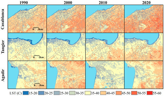 Temporal evolution of LST during summer (June–August) for coastal Moroccan cities (Casablanca, Tangier, and Agadir) from 1990 to 2020. The color gradient represents LST intervals from 15 to 60 °C, with blue indicating lower temperatures, yellow medium temperatures, and red higher temperatures.