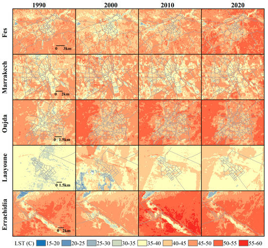 The analysis of LST evolution in the target Moroccan cities, shown in Figure 3 (coastal cities) and Figure 4 (inland cities), reveals a general trend of increasing temperatures over the three-decade period (1990–2020), with some variations and exceptions. The satellite images used to extract the LST data were specifically gathered during the summer months of June, July, and August. This timing aligns with the post-harvest season for the most common crops in Morocco, wheat and barley [48]. During this period, fields are typically left fallow after harvest, which could potentially contribute to the bareness of the lands and consequently higher temperatures.