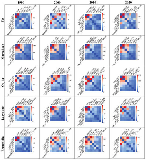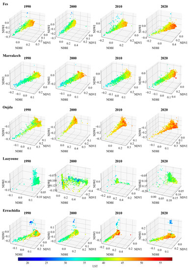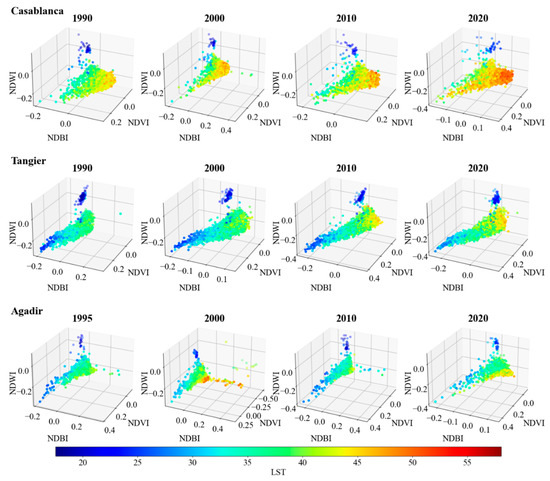 Commencing with the coastal cities (Figure 5), the spectral indices of Casablanca, Tangier, and Agadir depict relatively consistent values across the observed years, while portraying a marked evolution in LST. More specifically, most points in Casablanca’s 1990 plot present LST values predominantly between 16 °C (represented by a dark blue color in the jet colormap) and 50 °C, with similar ranges of NDVI, NDBI, and NDWI. However, by 2020, the points exhibited a perceptible shift towards warmer temperatures, particularly where NDBI > 0 and NDVI < 0.1. Tangier and Agadir displayed comparable trends, with LST increasing notably in 2020 in most data points and the number of cooler points (blue-colored dots) with NDWI < 0 and NDBI < 0 decreasing.