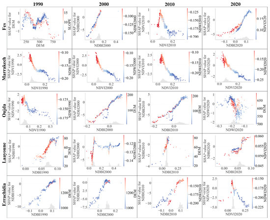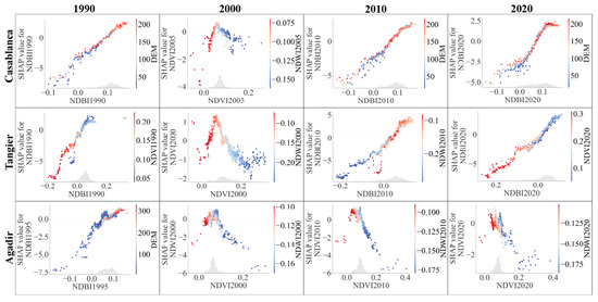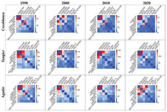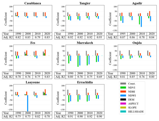 The results of the GWR analysis provide quantitative insights into the relationships between LST and the selected factors. The results of the GWR analysis are shown in Figure 7, focusing on the spectral indices of three Moroccan coastal and inland cities across the years 1990, 2000, 2010, and 2020, which are presented in this section. The detailed results are listed in Appendix A, Table A2 and Table A3 for coastal and inland cities, respectively.