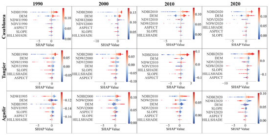 The ML models were interpreted, and the contributions of each factor to the predicted LST were ascertained using SHAP values. SHAP values serve as a consolidated measure of feature importance and a potent tool for interpreting ML models [42]. These values provide insights into each feature’s contribution to the prediction for each observation, thus offering a nuanced understanding of the model’s behavior.