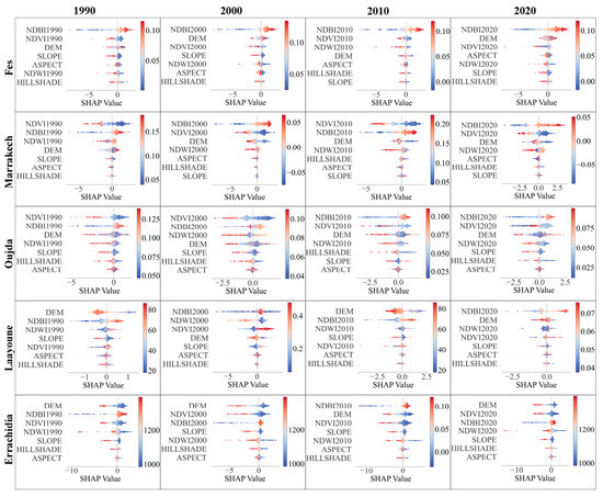 In Fes, the constant values reveal a relatively fluctuating trend in the LST. NDVI values have shifted from negative to positive, suggesting significant changes in vegetation cover. A consistent rise in NDBI values might indicate an increase in built-up areas. Notably, NDWI values have also moved from negative to positive, signifying variations in water content. Among other factors, aspect and hillshade show a consistent negative trend, while DEM and slope values show minimal changes. The adjusted R2 shows an increase in 2020 after an initial decline, pointing to an improvement in the model’s predictive power.