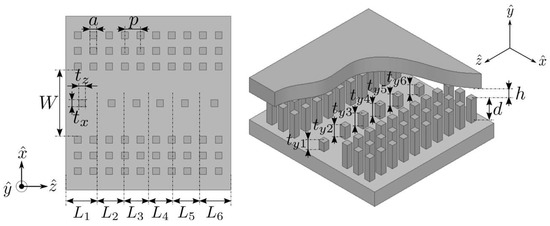 Figure 3 represents the structure and the equivalent circuit of the ith-section () of the fifth-order stepped impedance filter shown in Figure 1. Each section of the filter has a length , which includes a metallic pin centered on the width W of the GGW. The metallic pin works as an impedance inverter , while the length realizes a phase shift of . Figure 4 depicts the simulated -parameter of the ith-section of the filter structure as a function of the three dimensions (, , ) of the metallic pin. The dimensions of the base GGW were the same as in Table 2. The centered metallic pins were considered square like those of the PMC sidewalls. The initial size of the centered metallic pin was fixed to that of the square metallic pin of the PMC sidewalls, except the height, which was selected at half: mm and mm. As can be seen in Figure 4, the variation between 0.5 mm and 8 mm of the pin width (, ) according to the x or z axis has little effect on the -parameter, since its magnitude can only vary between 0.88 and 0.7. However, the behavior is different when the pin height increases from 0.5 mm to 8 mm since the magnitude of decreases from 0.99 to 0.01. Therefore, to achieve the design specifications of the filter (Table 1), the height of the metallic pin and the length of the six sections will be adjusted, while the widths and of all inverters will be fixed to 2 mm for practical considerations.